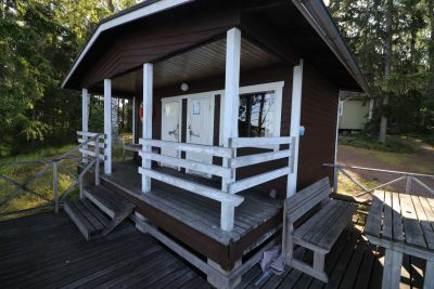 - Erillinen asuinmökki, jossa keittonurkkaus, jääkaappi, mikro, kahvinkeitin, pöytä ja parvi
